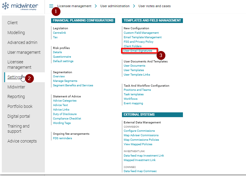Hover of the main menu (1), hover over settings (2) and select User Email Signatures (3):
